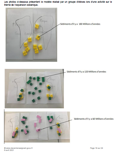 Objectifs spécifiques de la séquence d’apprentissage (côté professeur) | Étude des anomalies magnétiques, mesures géodésiques, détermination de l'âge des roches par rapport à la dorsale, alignements volcaniques liés aux points chauds de manière à caractériser les directions et vitesses de déplacement des plaques. Identification des indices géologiques (marqueurs sismologiques, thermiques et pétrologiques) qui permettent d'identifier une zone de divergence ou une zone de convergence. |