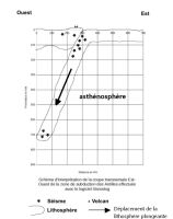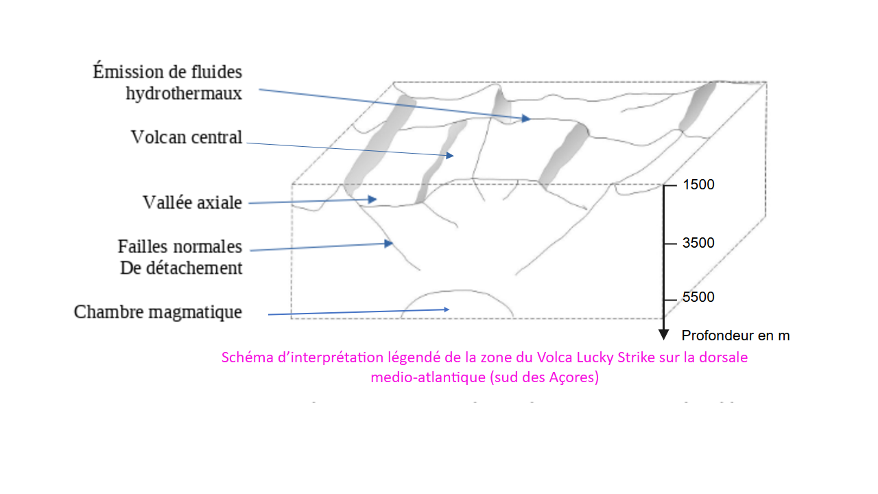 Activité 2 : Utiliser le schéma d’interprétation du profil de sismique réflexion de la zone du volcan Lucky Strike au niveau de la dorsale médio-atlantique Les connaissances déjà acquises au sujet des roches caractéristiques des croûtes océaniques et continentales seront réinvesties. | Les frontières de plaques de convergence en subduction présentent un flux géothermique minimal à l’aplomb de la fosse océanique et plus élevé dans les arcs volcaniques qui bordent cette dernière. Elles sont caractérisées par des foyers sismiques disposés selon un plan correspondant à la plaque plongeante et allant jusqu’à 700 Km de profondeur. Les dorsales sont des frontières de plaque convergentes avec un fort flux géothermique et une sismicité superficielle inférieure à 35 Km de profondeur.