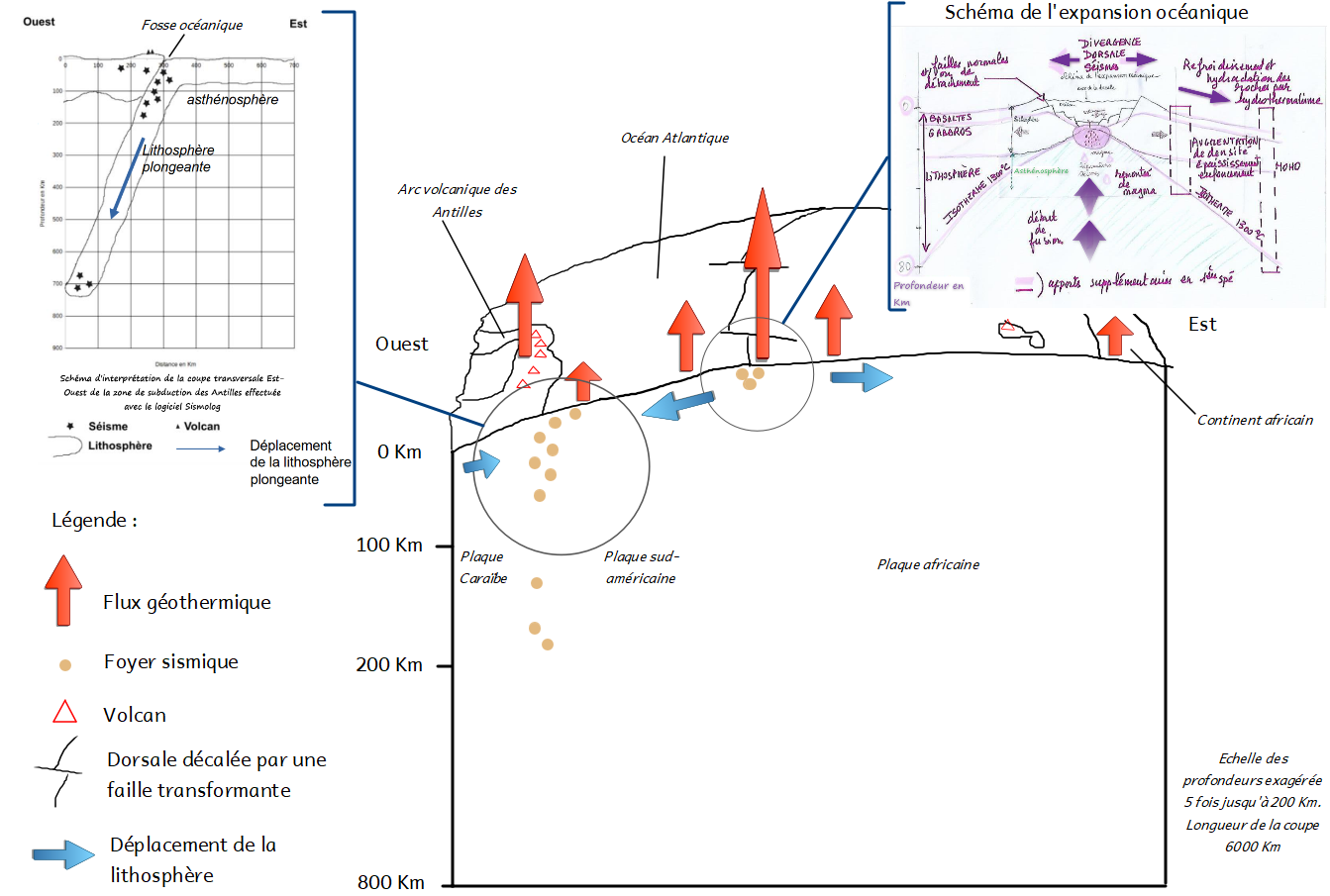 S3 | Séance de consolidation qui reprend les éléments déjà étudiés et permet d'évaluer l'assimilation des notions. | A la fin de la séance, je veux que les élèves aient identifié et mis en relation les différentes caractéristiques des plaques lithosphériques qui constituent l’océan atlantique en réalisant un schéma en coupe de l’océan atlantique. Les caractéristiques des limites de plaques y seront précisées. | A l'aide de l'ensemble des informations mises en évidence lors des séances précédentes, réaliser un schéma bilan montrant les différentes caractéristiques des zones de divergence et de convergence sous la forme d'une coupe de l'océan atlantique passant par les Antilles. | Bilan notionnel : voir schéma